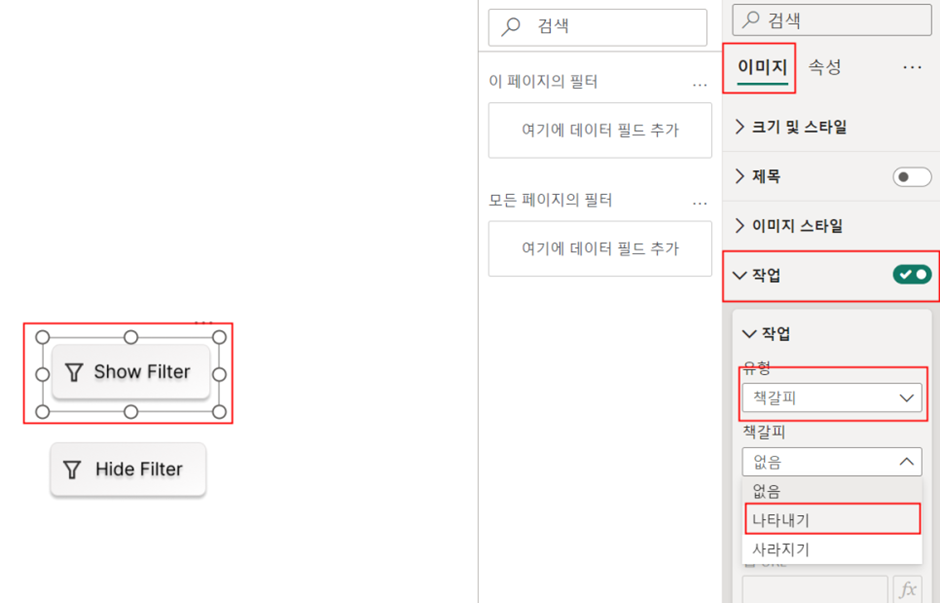그리고 동일하게 "Hide Filter" 이미지도 동일하게 "작업" 설정을 아래와 같이 해줍니다.