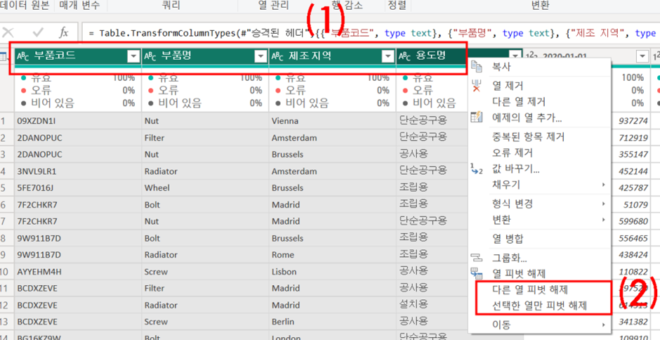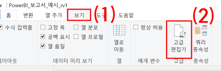 대부분의 파워쿼리 기본 기능은 (1) 리본 메뉴 탭에 있고,
