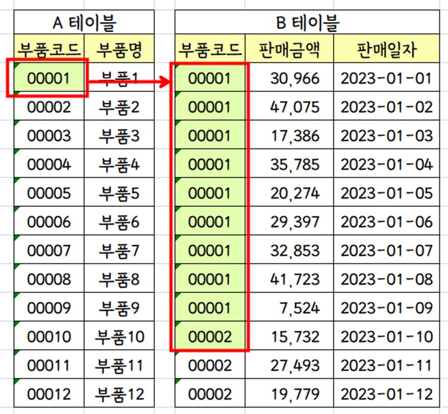 A 테이블에 부품코드 '00001'과 매칭되는 [판매금액], [판매일자] 칼럼을 가져오고 싶다면?