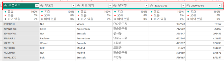 (1) 칼럼명 [부품코드] ~ [용도명] 클릭