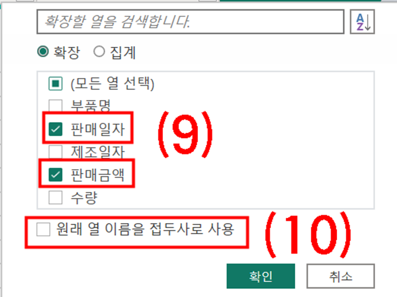 (10) "원래 열 이름을 접두사로 사용" 체크 해제 후