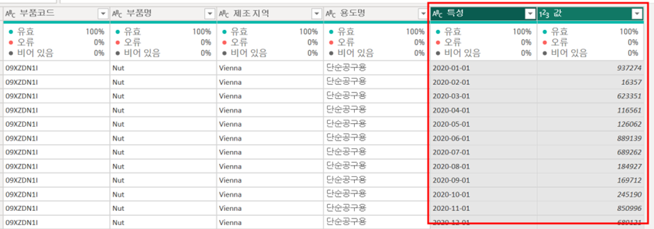 그럼 아래와 같이 [특성], [값]으로 나눠져서 칼럼이 행 단위로 전개되는 것을 보실 수 있습니다.