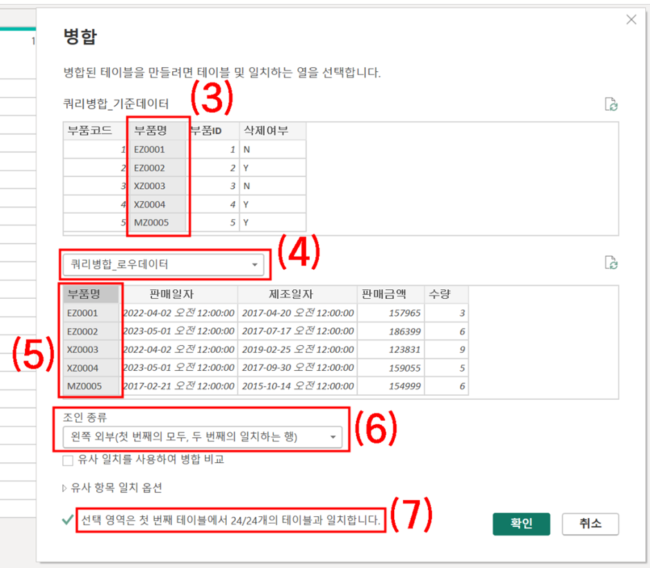 (5) 병합 기준이 될 B 테이블의 [부품명] 클릭
