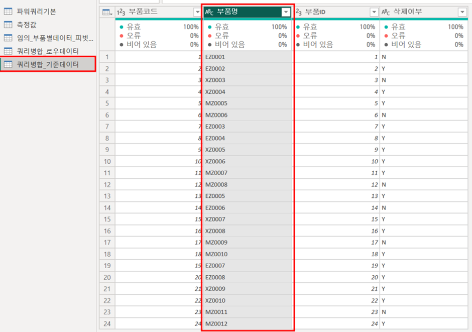 그 다음 이제 두 테이블의 "부품명"을 Join 해서