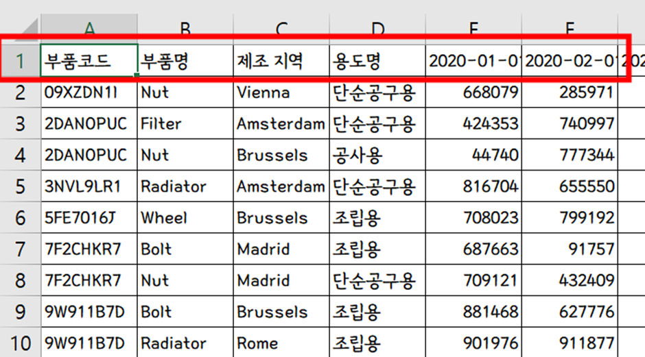 엑셀 파일 내에서는 아래와 같이 첫 행에 머리글이 위치해있음에도,