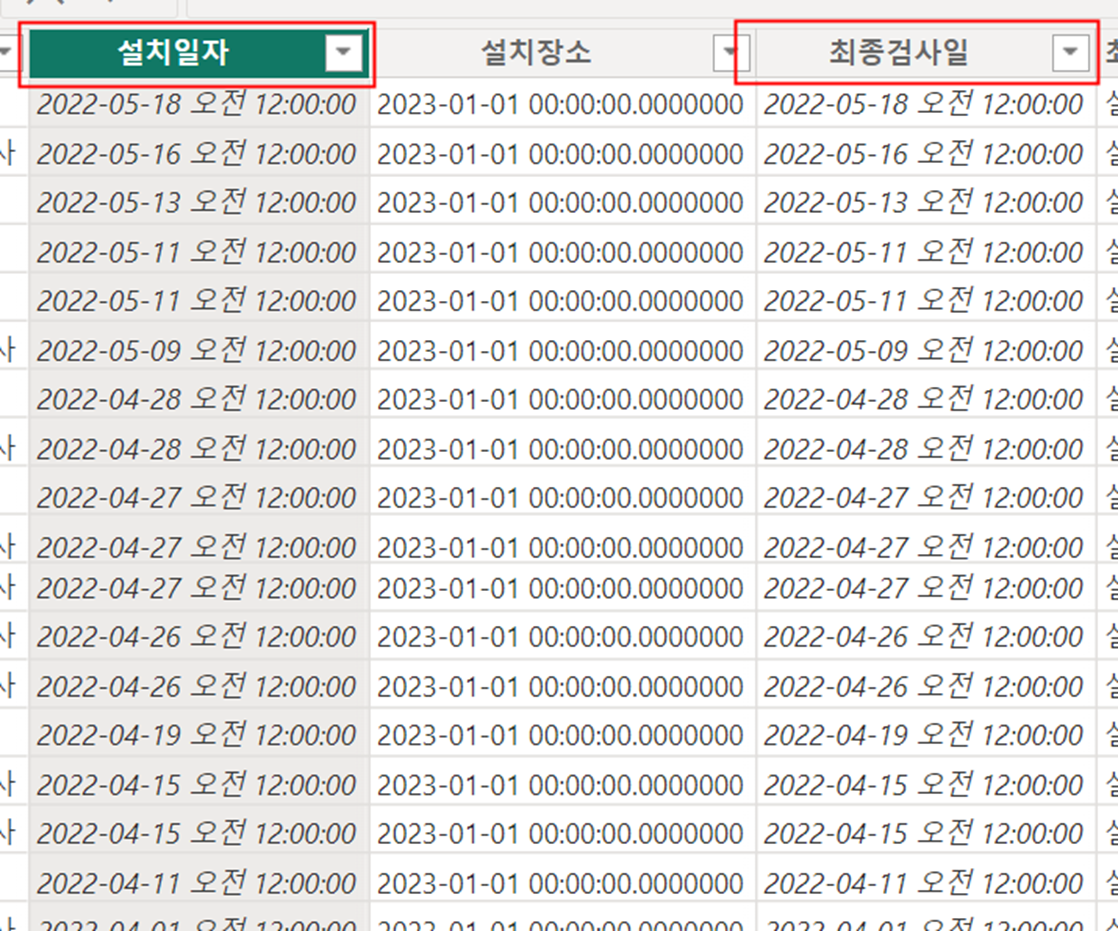 "날짜 테이블" - "파워쿼리 기본" 테이블 내 설치일자, 최초설치일자, 최종검사일자 등 간