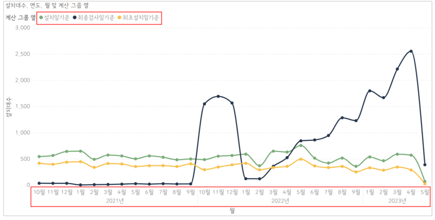 "설치대수" 라는 측정값을 설치일자, 최종검사일자, 최초설치일자 기준으로 데이터를 나눌 수 있는 기능입니다.
