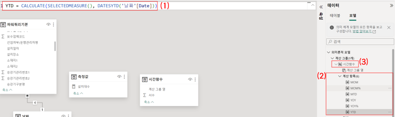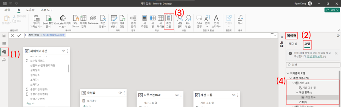 (4) 그럼 "계산 항목" 이라는 DAX 측정값이 활성화되며,