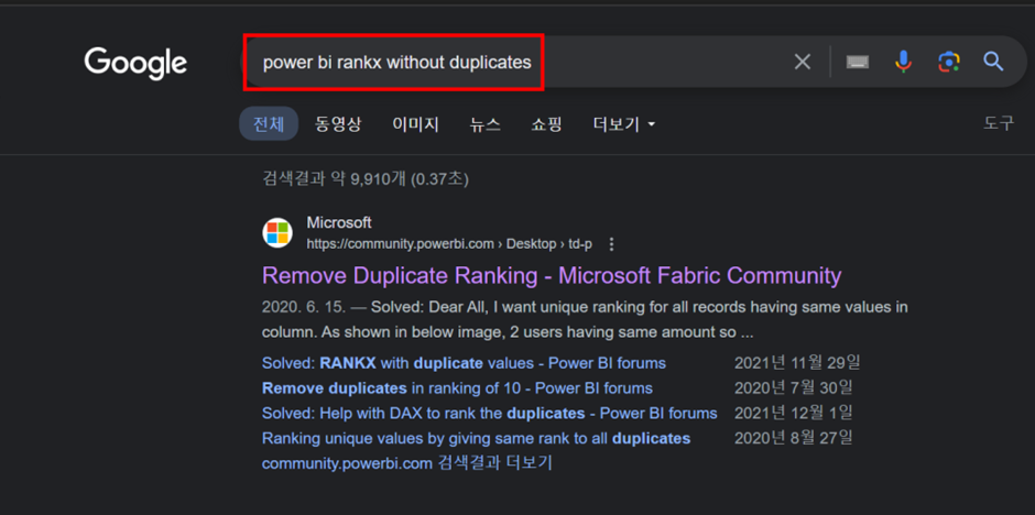 "Power BI RANKX without duplicates" (영어로 쳐줘야합니다.)