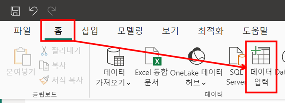 1) [홈] 리본메뉴 탭 - [데이터 입력] 버튼 클릭 해주세요.