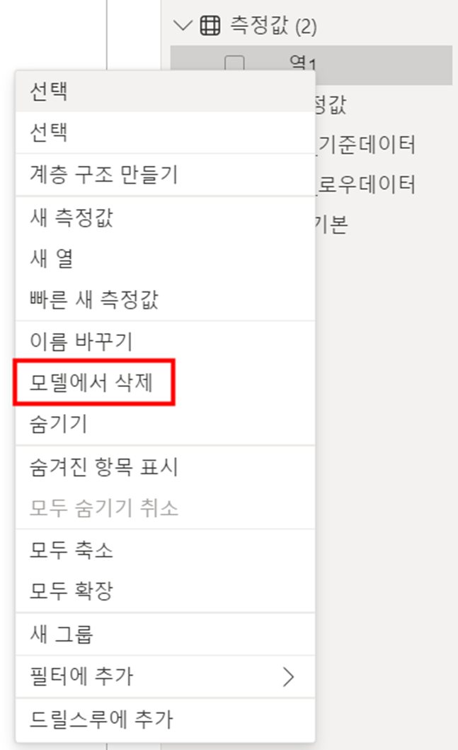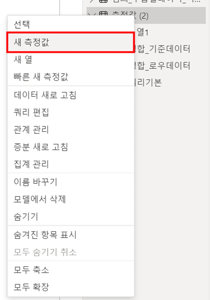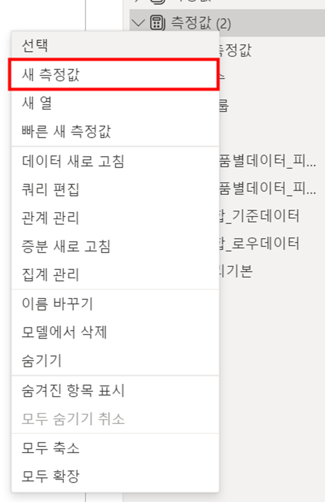 4) "측정값(2)" 테이블 마우스 우클릭 - [새 측정값] 클릭