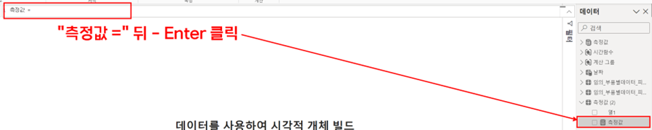 5) 그럼 측정값이 만들어 지는데, 바로 "측정값 = " 뒤에 마우스 커서를 두시고 [enter] 클릭