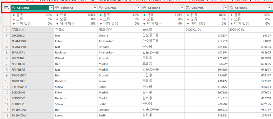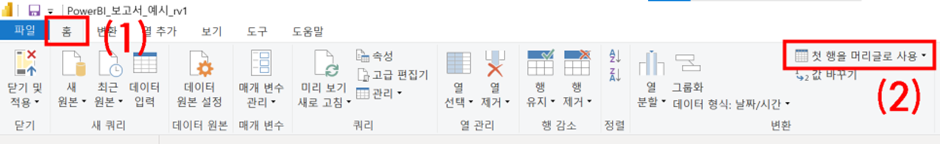 우선 첫 행을 머리글로 사용하는 기능은 [파워쿼리 화면] - [홈] - [첫 행을 머리글로 사용] 을 누르면 되는데
