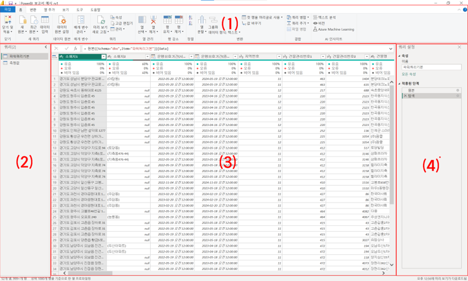 대부분의 파워쿼리 기본 기능은 (1) 리본 메뉴 탭에 있고,